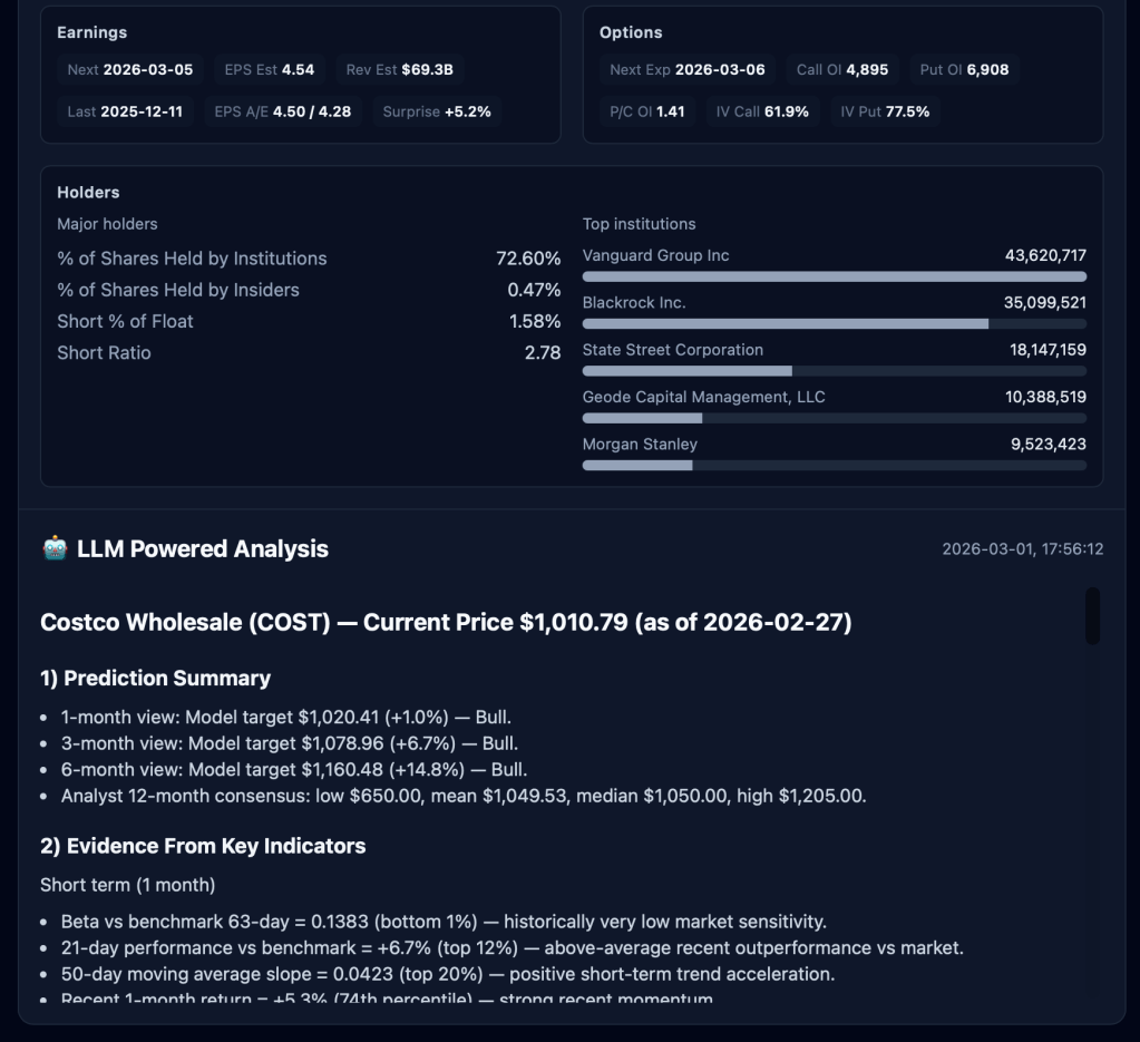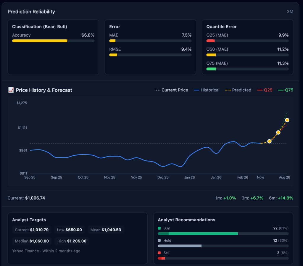 - Multi-Horizon Forecasting – Predictions for 1-month, 3-month, 6-month, and 12-month horizons with directional signals (BULL/HOLD/BEAR) and probability scores